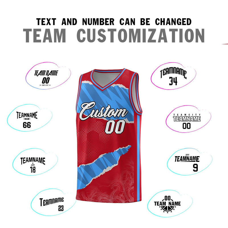 Custom Red Light Blue-Navy Tear Graffiti Pattern Sports Uniform Basketball Jersey